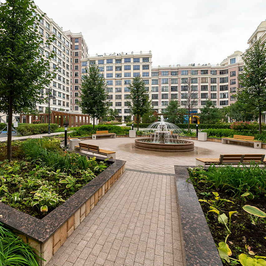 Внутренняя территория ЖК Литератор огорожена и охраняется. Всюду высажены живые изгороди, газончики и пышные кустарники. Для жильцов проложены мощеные дорожки для прогулок, оборудованы зоны отдыха со скамейками. Для детей построены игровые площадки, где можно весело провести время с друзьями, а большая площадь дворов позволит малышам кататься на велосипедах и самокатах.
